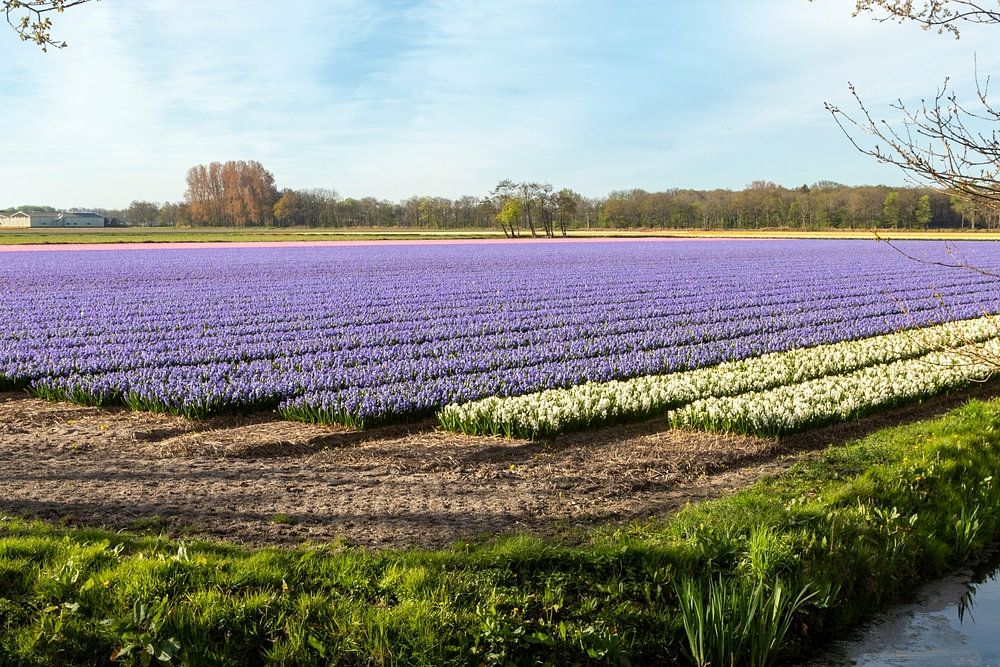 Ein farbenfroher Blick auf blühende Hyazinthen in der Zwiebelsaison, eine typisch niederländische Frühlingsszene, Lisse, Südholland, Niederlande.