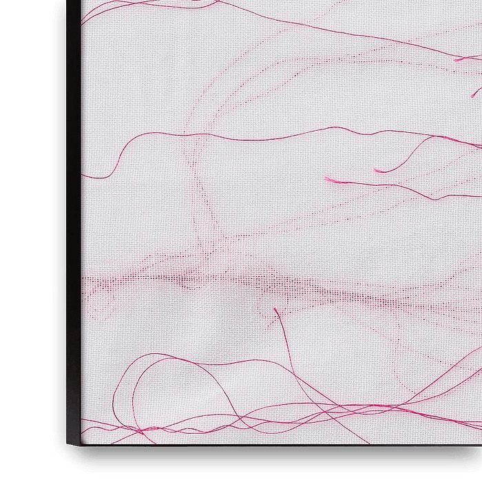 Eine figurative Arbeit aus rosa Faden auf Textil.