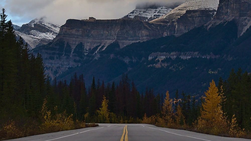 Aufnahme des berühmten Icefields Parkway im Jasper-Nationalpark, Alberta, Kanada im Abendlicht an einem wolkigen Tag im Herbst mit Straßenschild umgeben von verfärbten Bäumen mit schneebedeckten Bergen im Hintergrund.