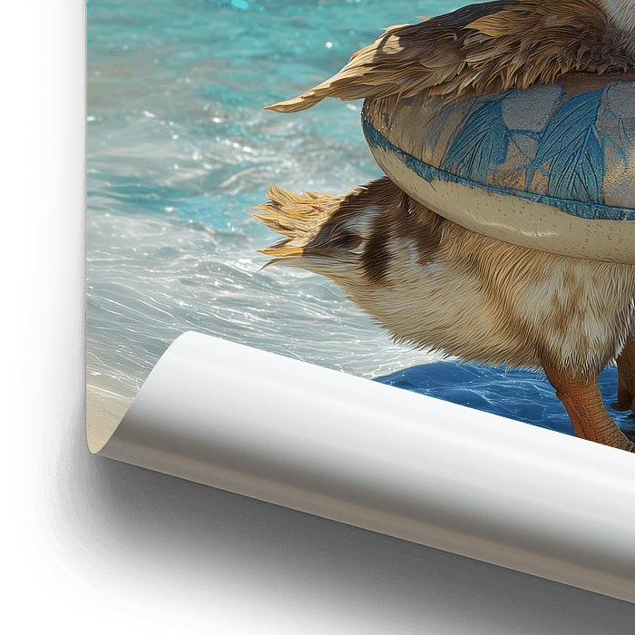 Lustiges Fantasieporträt eines süßen Entchens mit Sonnenhut und Schwimmring, bereit für den Sommer.