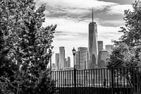 Ein harmonischer Blick vom Hudson River Walkway verbindet Natur mit der imposanten Skyline von Lower Manhattan. Zwischen Bäumen und gepflegten Sträuchern öffnet sich die Sicht auf eines der bekanntesten Wahrzeichen New Yorks. Das One World Trade Center ragt kraftvoll in den Himmel und wird von den modernen Hochhäusern des Financial…