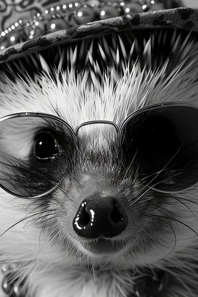 Ein charmantes Porträt eines Igels, gekleidet in eine stilsichere Jacke, Hut und einer runden Brille. Perfekte Balance zwischen Charme und Exzentrik.