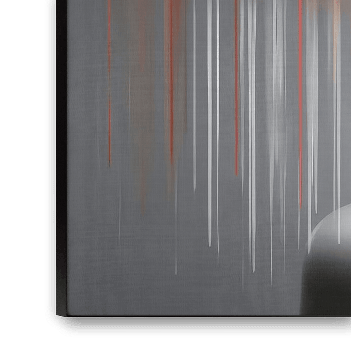 Dieses Werk verbindet klassische Schönheit mit moderner Street-Art-Ästhetik. Die Figur im Zentrum – eine ikonische Frau mit platinblondem Haar, geschlossenen Augen und betonten roten Lippen – wirkt zeitlos und entrückt. Ihre makellose Schwarz-Weiß-Darstellung wird durch die kräftigen Farbakzente durchbrochen: Orangerote und gelbe Farbspuren tropfen wie Regenlinien von oben nach unten, begleitet von dynamischen Spritzern.