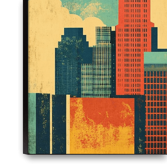 Dieses retro-inspirierte Design zeigt eine ikonische Skyline moderner Gebäude in einem farbenfrohen und detaillierten Art-Déco-Stil. Mit einer Kombination aus leuchtenden Farben wie Blau, Orange und Gelb vermittelt es ein nostalgisches Gefühl, das perfekt in eine moderne Umgebung passt. Das Design erweckt die Dynamik und Energie einer…