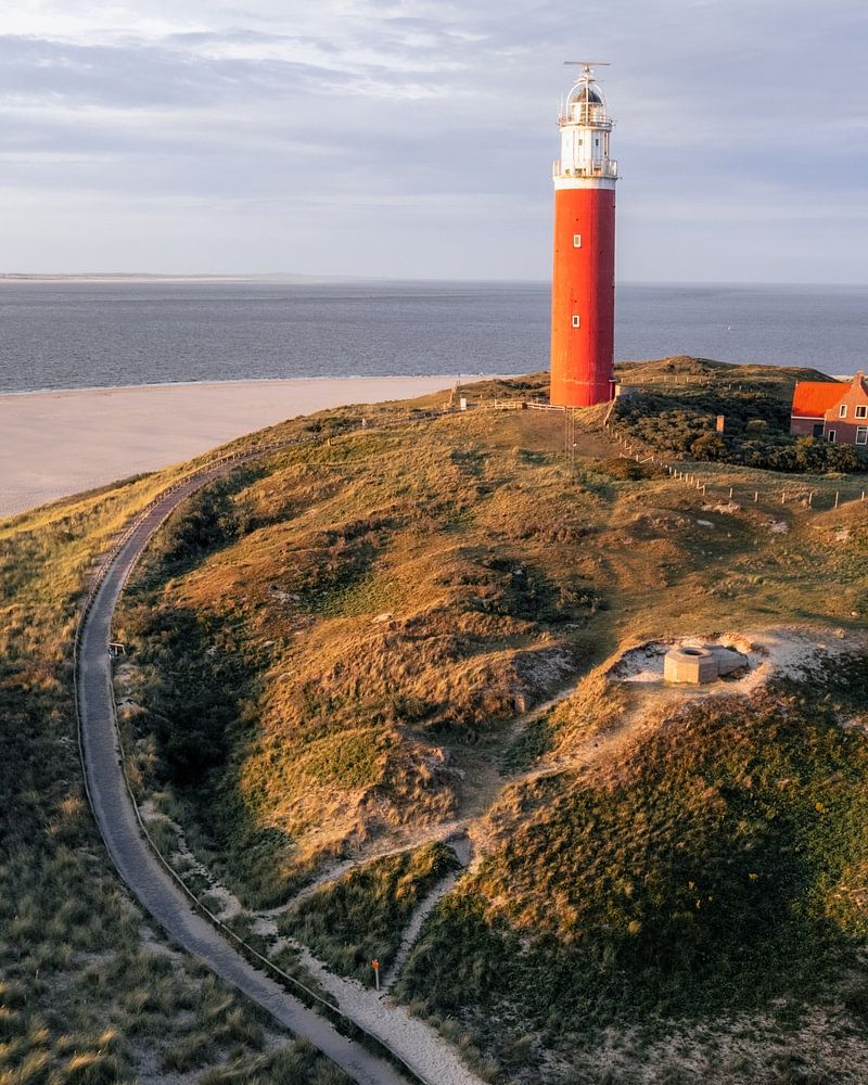 An der nördlichsten Spitze von Texel erhebt sich der ikonische Leuchtturm stattlich aus der Dünenlandschaft. Mit seiner leuchtend roten Farbe und seiner markanten Silhouette ist dieser Turm ein Wahrzeichen für jeden Besucher der Insel. Das Werk fängt den Kontrast zwischen der robusten Architektur und der sanft geschwungenen Dünenlandschaft um ihn herum ein.