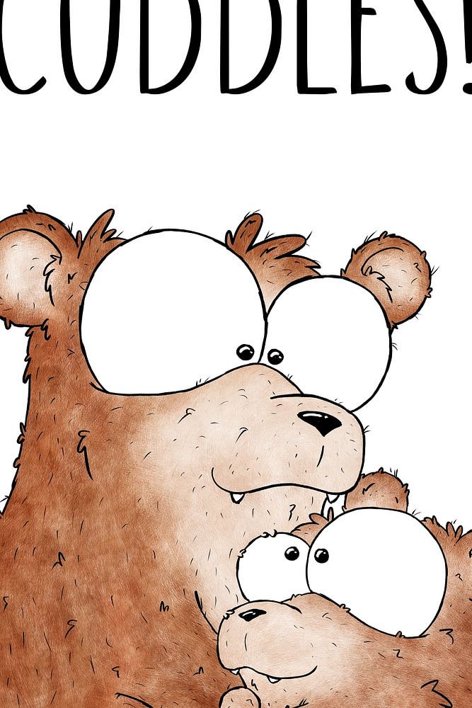Diese schöne Illustration von zwei süßen Bären im Gras, die sich gegenseitig umarmen, ist eine wunderbare Ergänzung für jedes Kinderzimmer! Der süße Text 'Hugs and cuddles!" die frischen Farben und die niedlichen Tiere bringen eine warme und fröhliche Atmosphäre in jede Einrichtung.