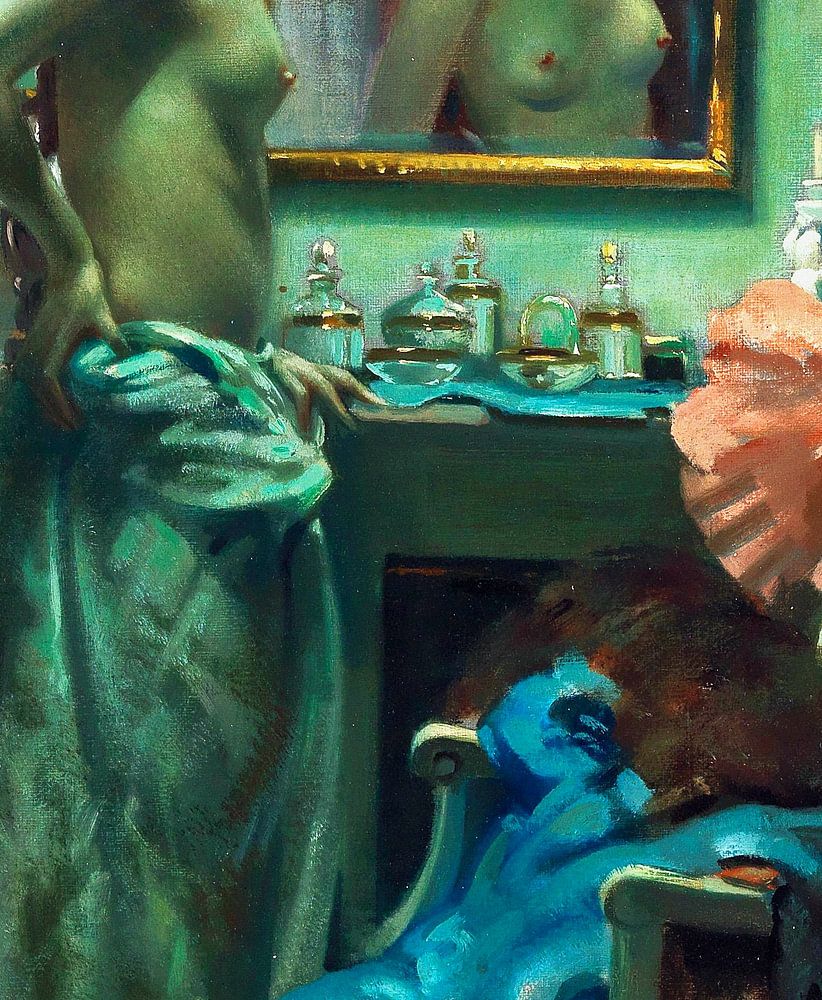 Die Hauptfarbe neben Blau ist Grün auf diesem teilweise nackten Porträt und dieser häuslichen Szene.