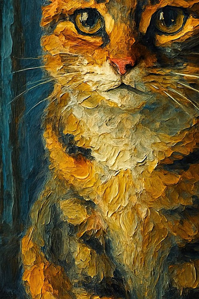 Dieses warme und intime Gemälde zeigt eine Katze, die im sanften Fensterlicht sitzt, aufmerksam, aber entspannt. Die Sonne fällt genau auf ihre Brust und Schnauze und beleuchtet das orange-braune Fellmuster wunderschön vor dem kühlen blauen Hintergrund.