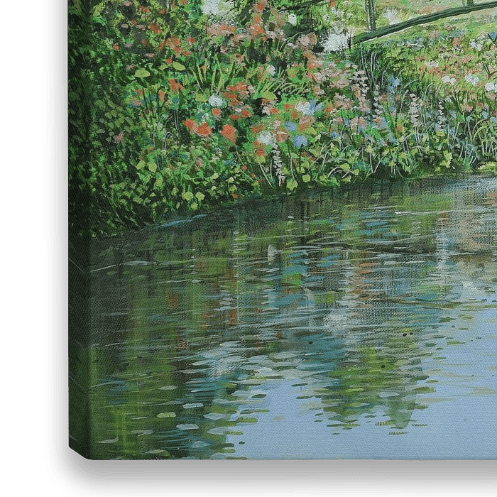 Dieses feine Gemälde, das eine Brücke über einen Teich zeigt, wurde von Monis Garten inspiriert, obwohl ich keine Fotovorlagen aus seinem weltberühmten Garten verwendet habe. Wie bei meinen anderen Kunstwerken handelt es sich um ein kreatives Produkt, bei dem ich eine heile Welt darstellen möchte.
