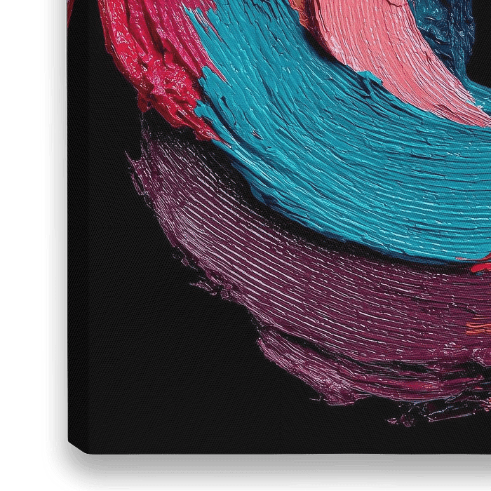 Ein abstraktes Kunstwerk, das aus dicken farbigen Pinselstrichen in einer kreisförmigen Komposition besteht. Die Farben fließen harmonisch zusammen und erzeugen ein Gefühl von Bewegung und Energie. Der Gesamtstil hat eine Aura des modernen abstrakten Expressionismus.
