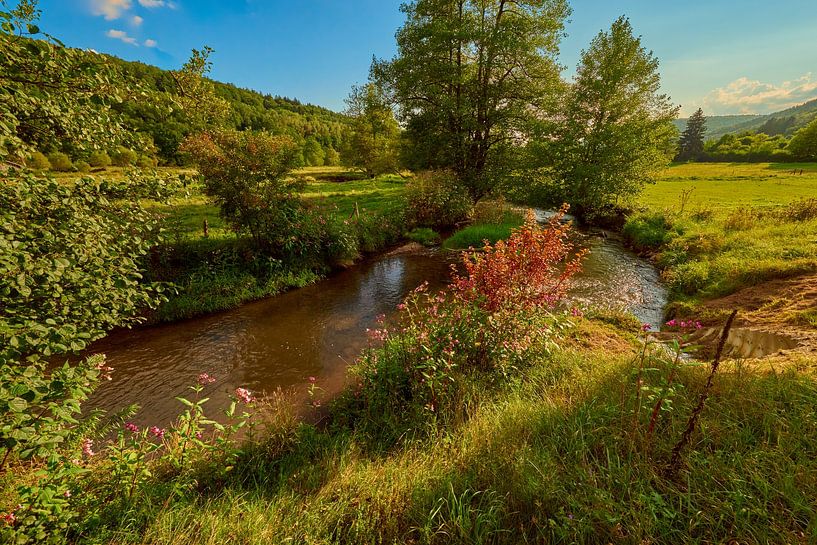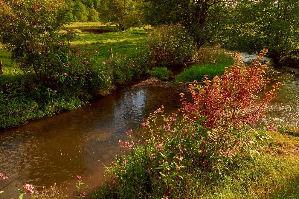 Im naturnah gebliebenen, traditionell geprägten Tal der Sinn nahe der Kurstadt Bad Brückenau in Bayern windet sich der Flusslauf durch seine grünlandgenutzter Aue und verbindet kleine Ortschaften.