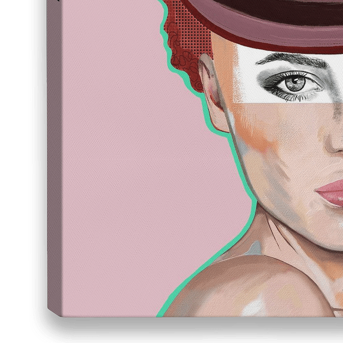 Gemaltes Porträt einer Frau, die einen Zylinder, einen lila Schmetterling und Blumen trägt.