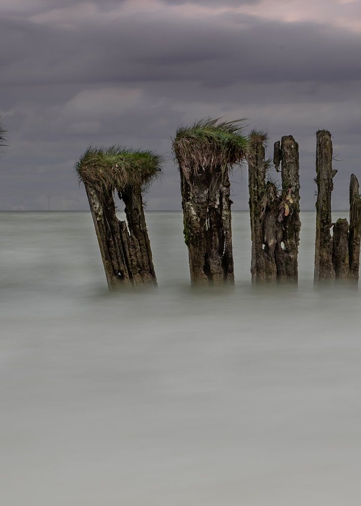 Fünf Holzpfähle, Teil eines alten Wellenbrechers im IJsselmeer. Sehr verwittert und mit Moos und Gras bewachsen. Der Zahn der Zeit und das Wasser haben ihre Spuren hinterlassen, aber sie stehen noch.