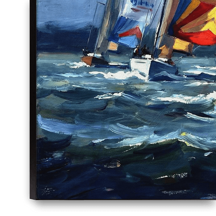 Tauchen Sie ein in die pulsierende Energie eines spannenden Segelrennens, eingefangen durch eine impressionistische Linse. Dieses dynamische Ölgemälde zeigt eine Flotte von Segelbooten, die unter stürmischem Himmel durch unruhige Gewässer navigieren und dabei den Nervenkitzel und die Herausforderung der offenen See verkörpern. Die…
