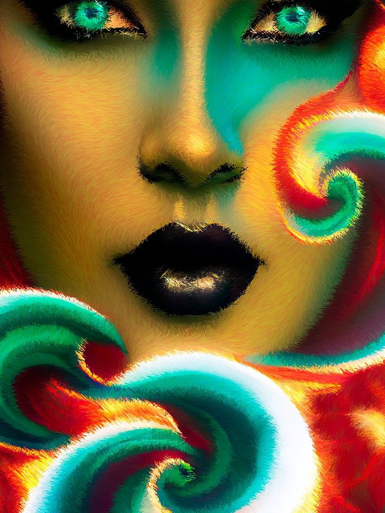 Auf rotem Hintergrund, ein Mädchen mit dunkler Haut im Profil in grün-gelben Wellen. An sich ist eine Frau schon ein Schatz. Sie ist in diesem Ozean des Lebens. Surrealismus. Abstraktion. Sie zieht das Auge an. Sie wird lebendig und anziehend zu betrachten. Einzigartige Technik des Autors in Form von Schraffuren. Das hat noch niemand gemacht. Das ist neu! Passt perfekt in viele Interieurs, die keine Angst vor Individualität und Denken haben.