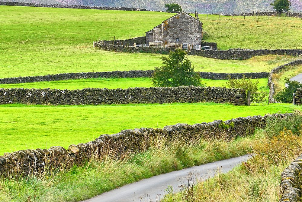 Typische Szene aus den Yorkshire Dales zur Zeit der Heideblüte. Aufgenommen nahe Hebden im Wharfedale. Großbritannien, im Sommer 2014.
