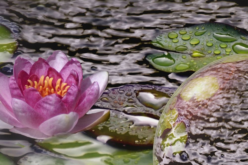 Seerose. pink, rosa, grün, Makroaufnahme, Sommer, magisch, mystisch, Botanik, Flora, Stillleben, Glaskugel, sparkling Drops, Kugelbild, Gartenkugel, Gärten, Rose, Rosen, Japan, Asien, Regentropfen, Wasserperlen, Tautropfen, Tropfenbild, Natur, Naturgarten, Regentag, Rainy Day, Lotosblüte