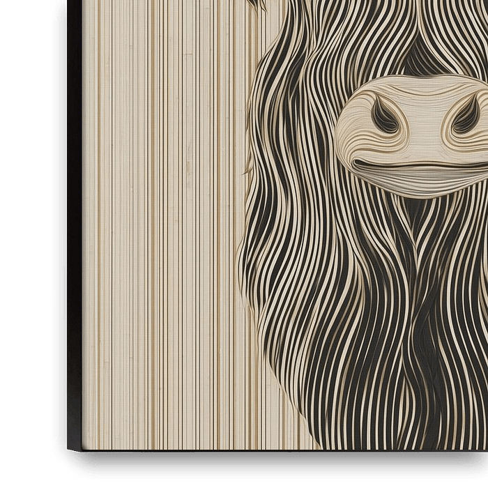 imposanter Hochlandstier in einem fast hypnotischen Linienspiel aus Schwarz und Beige. Die gesamte Komposition besteht aus kontinuierlichen, rhythmischen Linien, die nicht nur das Tier formen, sondern auch den Hintergrund ausfüllen, so dass der Stier mit seiner Umgebung zu verschmelzen scheint. Das Haar des Tieres fließt wie ein…