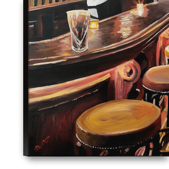 Bestelle diese Malerei In der Illuminated Dream Bar mit Barkeeper & Fremden von Markus Bleichner als Reproduktion auf Leinwand, Alu-Dibond, als Poster, Fototapete oder Acrylglasbild.