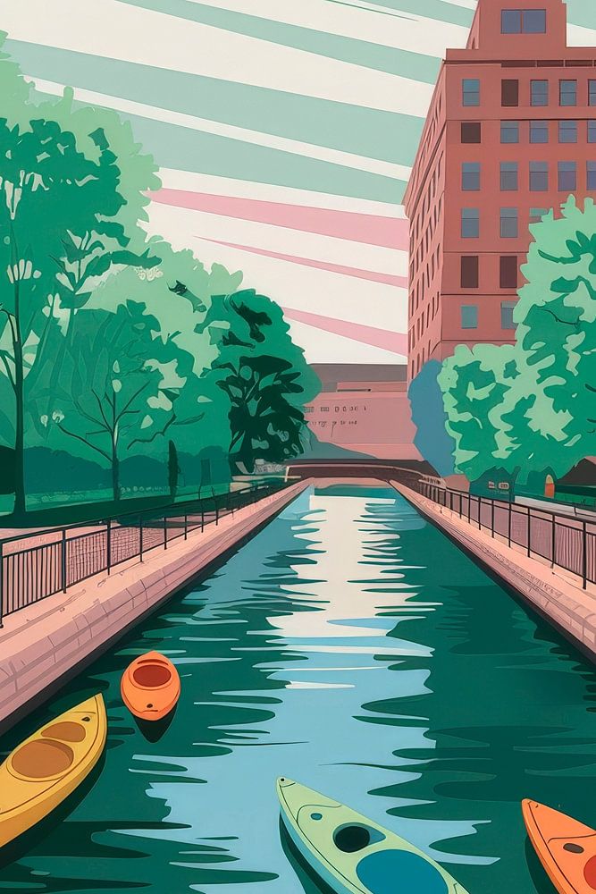 Umrahmt von sanften Pastellfarben und lebendigen Kanufahrern, verströmt die Szenerie in Indianapolis ein Gefühl von Freiheit und Abenteuer. Der ruhige Kanal, gesäumt von üppigem Grün und einer urbanen Kulisse, lädt dazu ein, die Hektik des Alltags hinter sich zu lassen. Ideal für ein Wohnzimmer, um eine entspannte Atmosphäre zu schaffen.