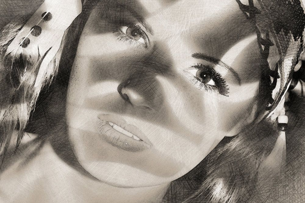 Porträt einer jungen Frau mit Federschmuck. Das Foto wurde als Bleistiftzeichnung in schwarzweiß illustriert.
