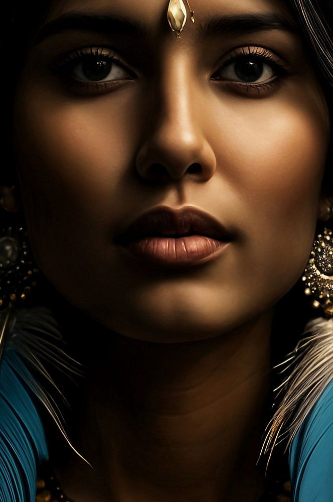 Um sie herum sind verschiedene natürliche Elemente, die ihre Verbindung zur Erde und zur spirituellen Welt betonen. Zarte Pflanzen und Blumen scheinen sich um sie zu gruppieren, während sanfte Winde durch die Szenerie wehen. Die Indianerin trägt auch kunstvollen Schmuck, der aus natürlichen Materialien gefertigt ist, was ihre Verbundenheit zur Natur unterstreicht. Ihre Haare sind elegant frisiert, möglicherweise mit Federn oder anderen dekorativen Elementen, die ihre kulturelle Bedeutung reflektieren.