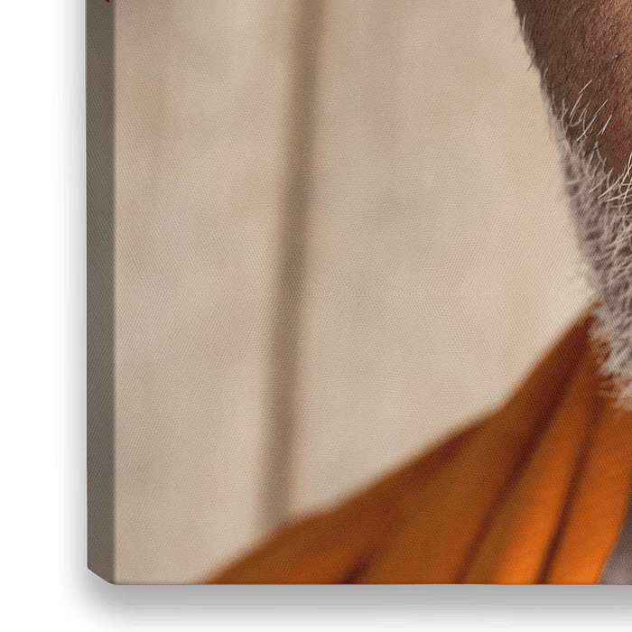 Dieses Bild zeigt eine indische Person, die einen leuchtend orangefarbenen Turban und ein orangefarbenes Gewand trägt. Der Hintergrund scheint eine Holzoberfläche mit vertikalen Brettern zu sein. Die leuchtende Farbe des Turbans und des Gewandes steht im Kontrast zu den gedämpften Tönen des hölzernen Hintergrunds, wodurch die Kleidung…
