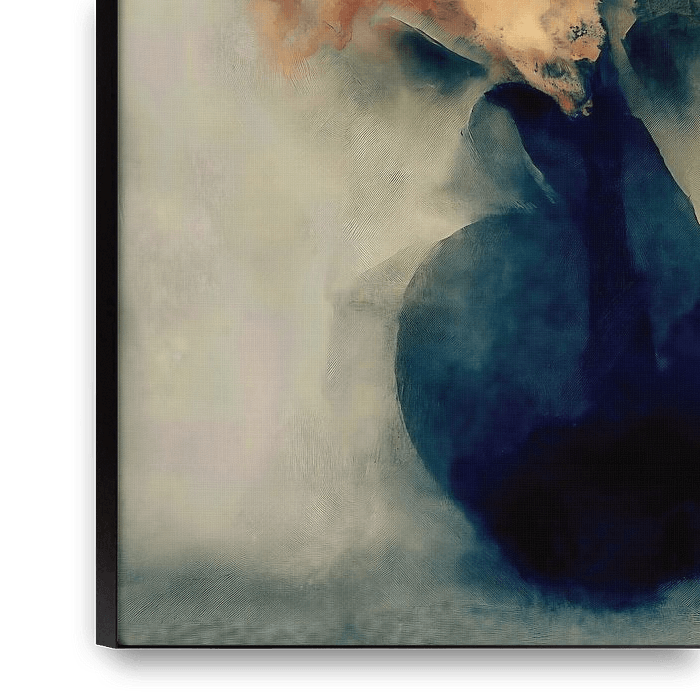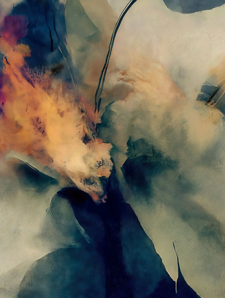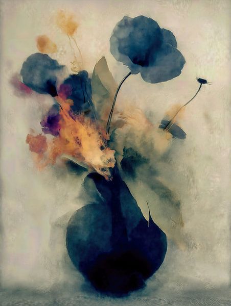 Eine stimmungsvolle, abstrakte Blumenkomposition mit tiefindigoblauen Blüten, die sich aus einer dunklen Vase erheben. Sanfte Aquarelltexturen und rauchige Farbtupfer in warmen Tönen schaffen eine stimmungsvolle Balance zwischen ruhiger Eleganz und ausdrucksstarker Bewegung