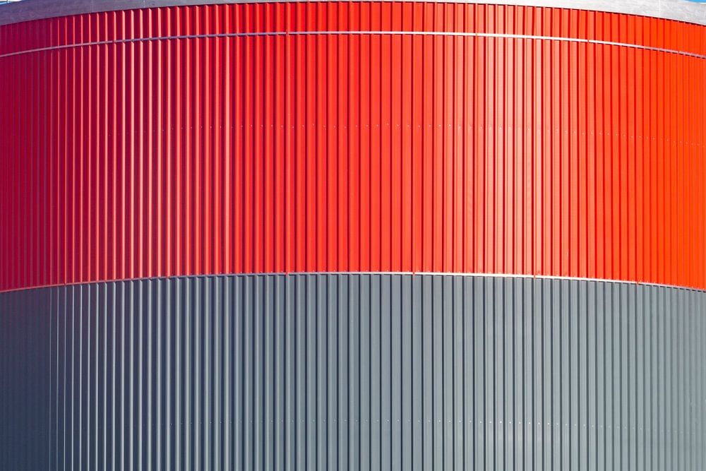 Industrielle Lagertanks in Nahaufnahme, die ein abstraktes Linienmuster und eine Form mit einem blauen Himmel im Hintergrund bilden.