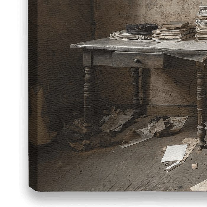 Schreibtisch in einem alten baufälligen Raum eines großen Hauses. Die Tapete kommt bereits von der Wand. Die Bilder sind alt und verfärbt. Dennoch kann man immer noch an diesem Schreibtisch arbeiten