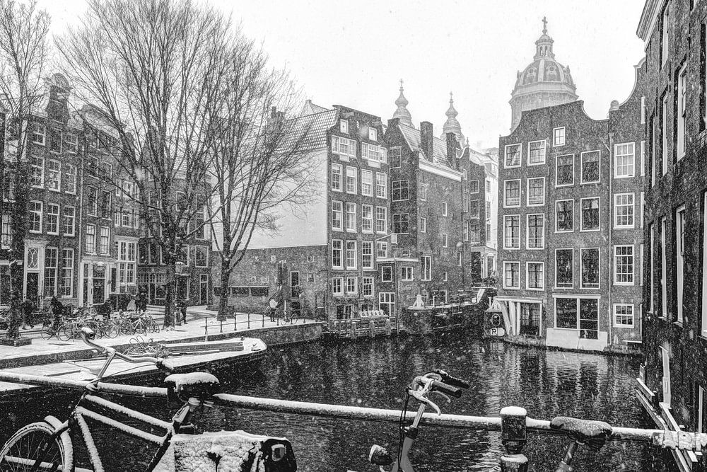 Es schneit in Amsterdam. Es ist kalt und glitschig. Ein heftiger Wind weht durch die Straßen und Kanäle. Die meisten Touristen sind innen warm