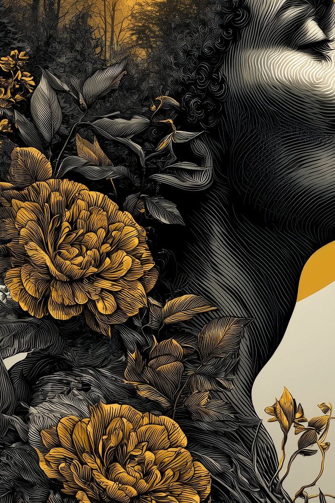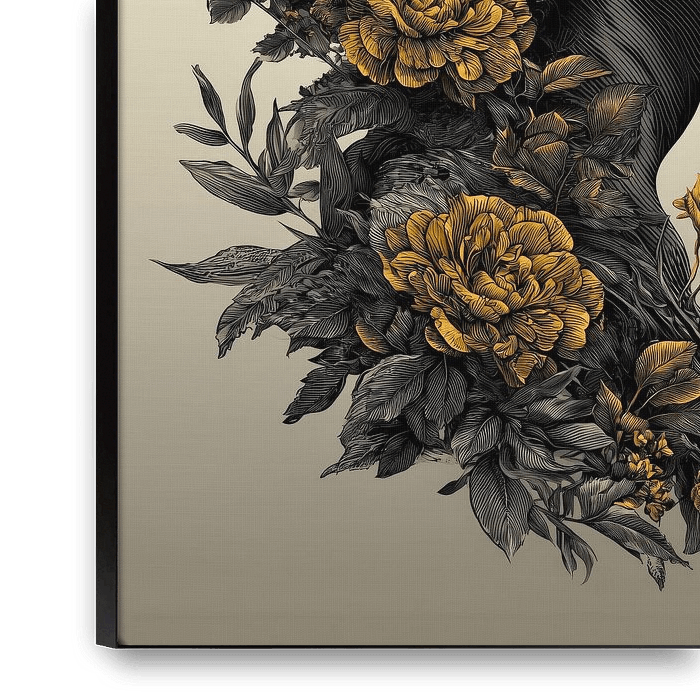 Dieses kraftvolle Kunstwerk fängt einen Moment der Ruhe, Verbundenheit und Selbstreflexion ein. In einer raffinierten Doppelbelichtung verschmelzen das Profil einer Frau, üppige Blumen und eine mystische Waldlandschaft zu einem harmonischen Ganzen. Die warmen Goldtöne kontrastieren wunderbar mit dem tiefen Schwarz und verleihen dem Werk…