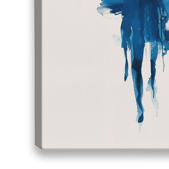 Ein minimalistisches Aquarell mit den Silhouetten Frauen in dunklem Blau, das mit sichtbaren Pinselstrichen und einer Nass-in-Nass-Technik gemalt wurde. Die nasse Tinte tropft und vermischt sich mit dem Papier, wodurch Farbspritzer und -tropfen entstehen, die für Textur sorgen. Die Ränder sind weich und die Details sind mild.