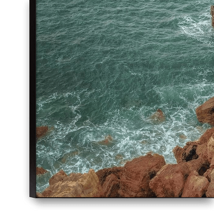 Das Kunstwerk zeigt eine kleine Felseninsel in der Nähe von Sagres an der portugiesischen Atlantikküste. Die Insel ragt steil aus dem Meer auf und wird von der tosenden Brandung umspült. Der sandsteinfarbene Fels strahlt in warmen Gelb-Orangetönen und verleiht der Szenerie eine besondere Atmosphäre. Auf der schroffen Insel befindet sich…