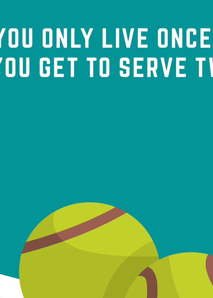 Ein modernes Motivationsposter mit dem aufmunternden Zitat "YOU ONLY LIVE ONCE, BUT YOU GET TO SERVE TWICE" in fetten weißen Großbuchstaben vor einem leuchtend blaugrünen Hintergrund. Zwei leuchtend gelb-grüne Tennisbälle sind am unteren Rand positioniert, zusammen mit weißen geometrischen Linien, die an einen Tennisplatz erinnern. Das Design kombiniert Sportbilder mit Lebensphilosophie und ermutigt zu Optimismus und einem zweiten Leben.