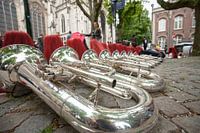 Details zu einer Musik-, Show- und Marschkapelle. Komposition von Helmen und Blasinstrumenten wie z.B. dem Bariton. Eine ordentlich strukturierte Anordnung in einer Reihe auf der Straße liegend. Schönes Bild für eine musikbezogene Atmosphäre