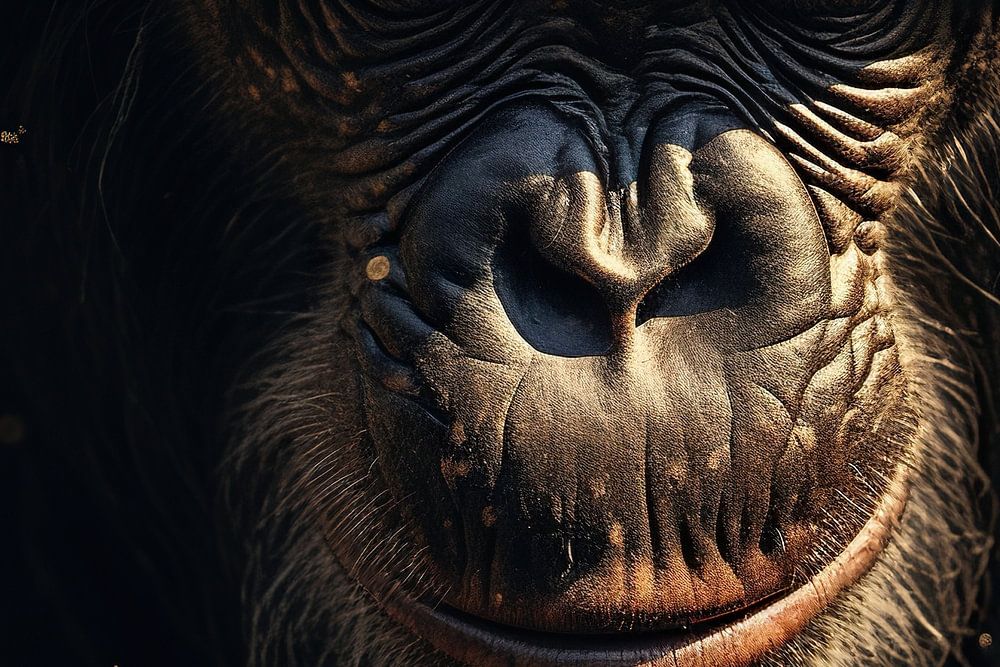 Intensiver Blick - Das Gemälde zeigt eine Nahaufnahme eines Schimpansen mit durchdringendem Blick, der in ein subtiles Licht getaucht ist, das seine ausdrucksstarken Gesichtszüge und die Struktur seines Fells hervorhebt. Die Brauntöne und das goldene Licht schaffen eine warme Atmosphäre, während der dunkle Hintergrund das Motiv hervorhebt und ein Gefühl von Tiefe vermittelt.