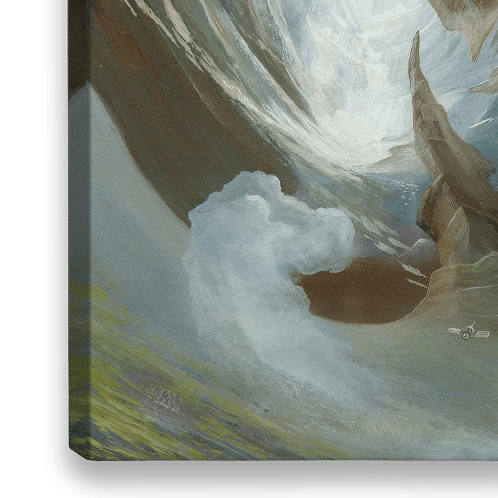Dieses Gemälde offenbart eine apokalyptische Szenerie, in der gigantische Erdplatten in einer faszinierenden Symbiose miteinander verbunden werden, angetrieben von unsichtbaren, kosmischen Kräften. Die Erde, Kontinente und terrestrische Platten von enormer Größe scheinen sich zu verbiegen und zu verdrehen, während sie von einem…