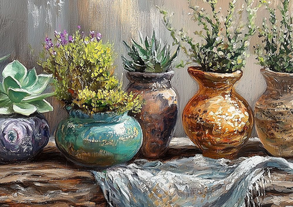Earthy Tranquillity ist eine heitere Komposition, die die beruhigende Kraft der Natur widerspiegelt. Töpfe mit Pflanzen stehen im Mittelpunkt dieses Stilllebens, wobei die Töpfe in verschiedenen Brauntönen ausgeführt sind, die von warmem Karamell bis zu tiefem Terrakotta reichen. Diese erdigen Farben strahlen ein Gefühl von Stabilität und Zeitlosigkeit aus.
