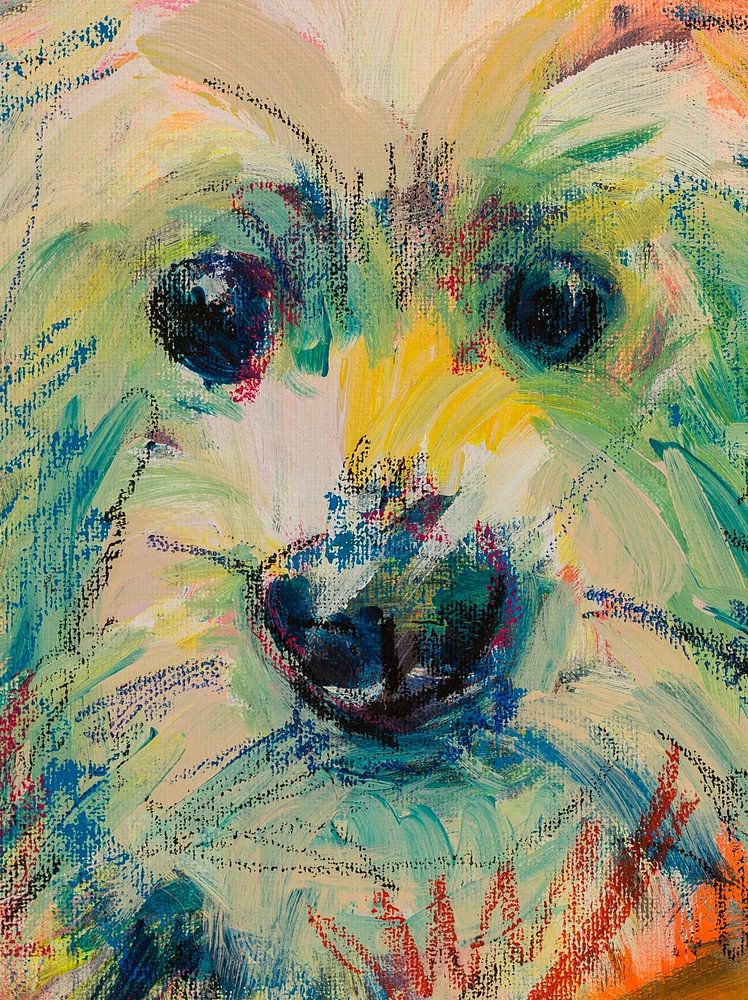 Ausdrucksstarkes Gemälde eines irischen Soft-Coated Wheaten Terrier Hundes. Dieses Porträt ist spontan und lebendig gemalt. Wer würde dieses lustige Tier nicht an der Wand haben wollen?