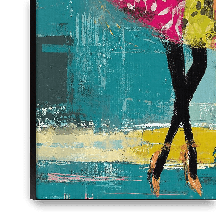 Irland Gemälde einer Frau | Frau im Kleid – Auf diesem Gemälde ist eine Frau in einem auffälligen Kleid mit Blumenmustern zu sehen, das Energie und Farbe ausstrahlt. Das Gemälde hat einen abstrakten Stil mit leuchtenden Farben wie Rosa, Gelb und Türkis.