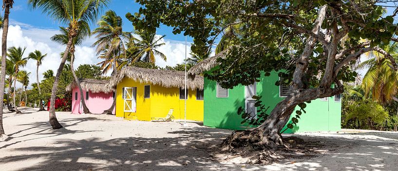 Farbenfrohe Häuser an Westküste der Insel Catalina in der Nähe von La Romana. Im Hintergrund strahlend blauer Himmel mit Wolken über der über der karibischen Insel.