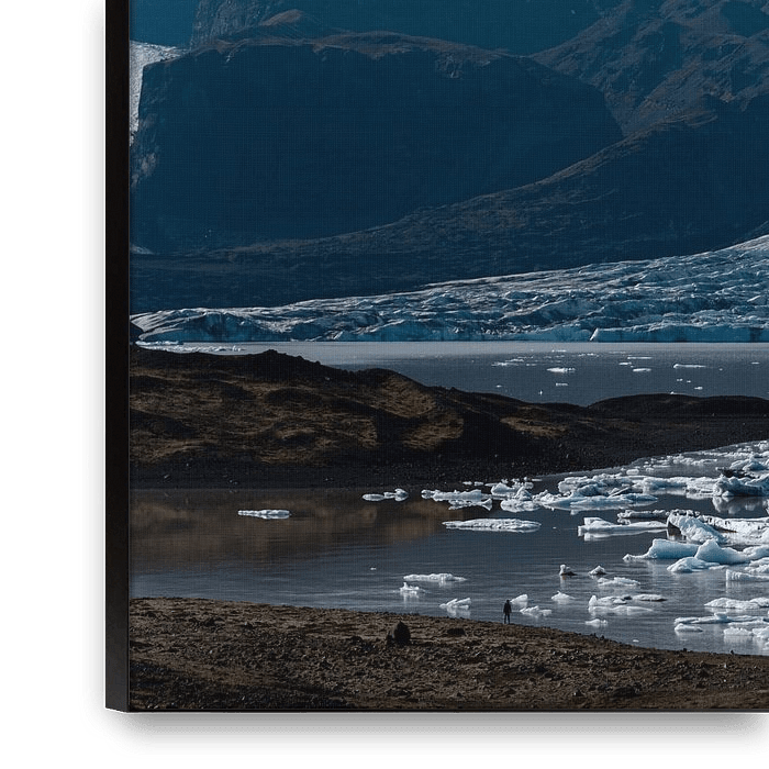 Ich habe die Gletscherlagune in Island besucht und einige Fotos gemacht. Dies ist eines meiner Lieblingsbilder, weil es ein solches Gefühl des Nichts vermittelt. Die Landschaft ist mit einer Decke aus Schnee und Eis bedeckt. Einige Schneeklippen schwimmen im Meer und überblicken die Berge. Unten in der Mitte sieht man jemanden, der sehr…