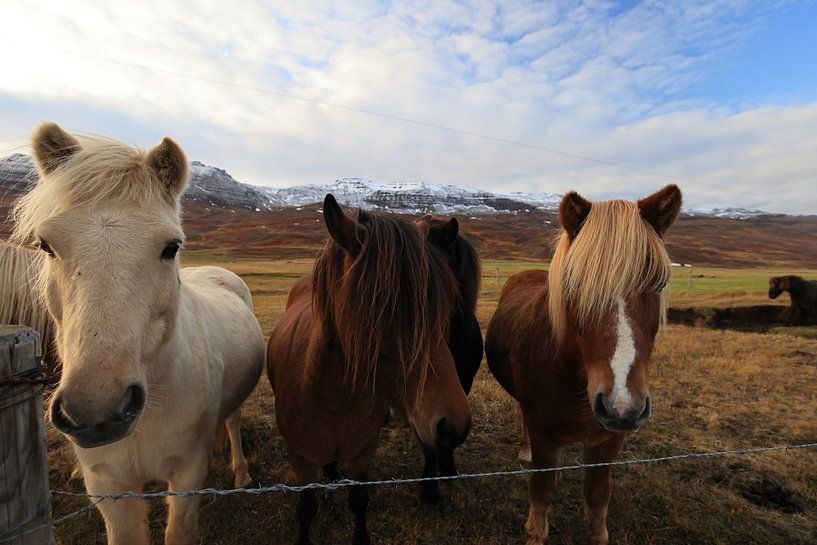 Bestelle das Foto Islandpferde auf einer Wiese von Frank Fichtmüller als Reproduktion auf Leinwand, Alu-Dibond, als Poster, Fototapete oder Acrylglasbild.