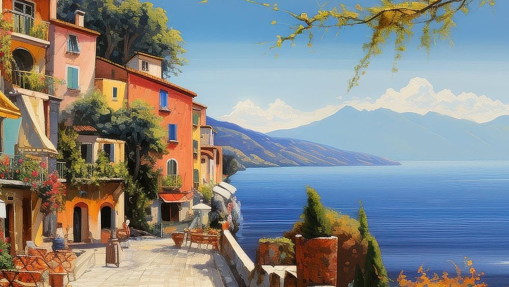 Bestelle diese Malerei Italien Gardasee künstlerisches Panorama von TheXclusive Art als Reproduktion auf Leinwand, Alu-Dibond, als Poster, Fototapete oder Acrylglasbild.