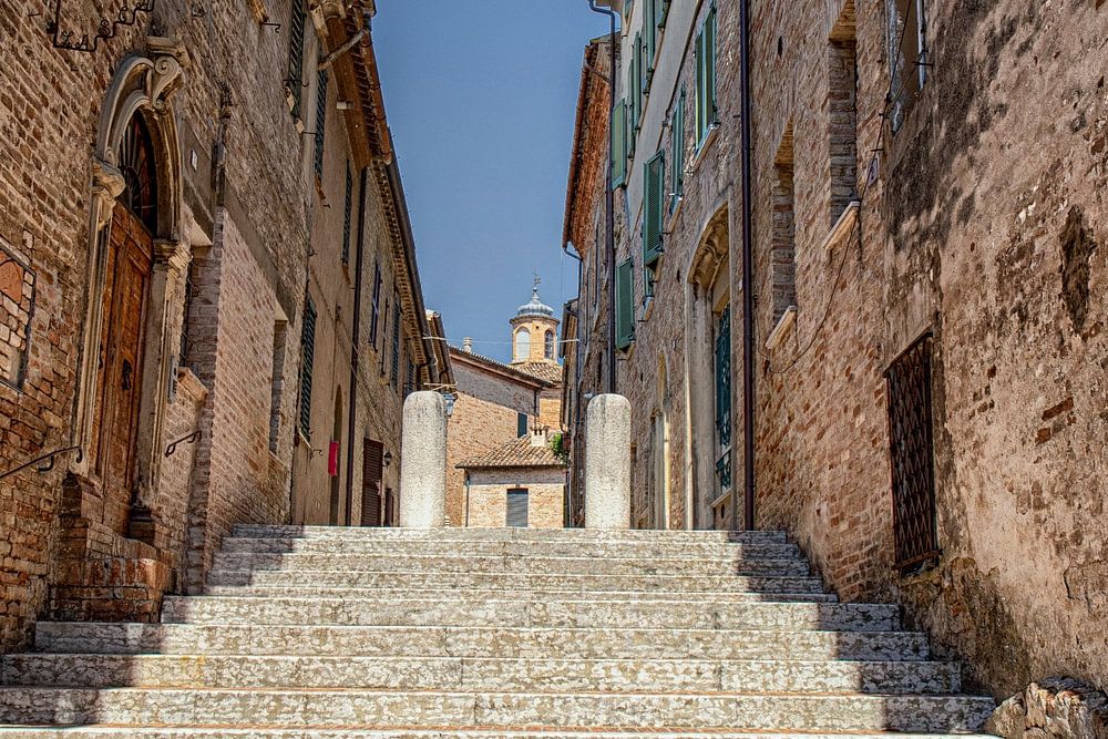 Hergestellt in Urbino, der ältesten Stadt und Universitätsstadt in den Marken, Italien. Zeigt das Altertum und die historischen Mauern dieser Stadt. Viele Treppen, viel Sonne, also auch viel Schatten zum Fotografieren. Eine sehr schöne Stadt zum Fotografieren.