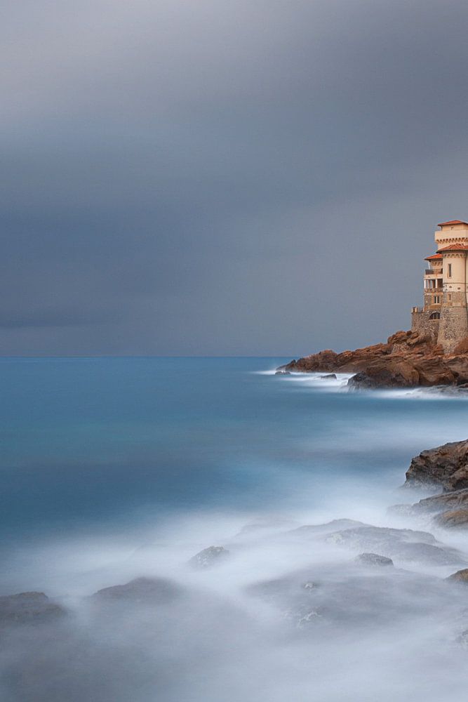An der italienischen Küste während eines Gewitters am Tyrrhenischen Meer. Die lange Verschlusszeit lässt das über die Felsen wirbelnde Wasser wie eine seidenweiche Decke erscheinen.