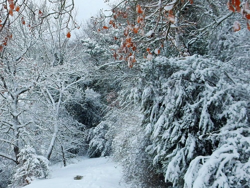 Eine kalte italienische Schneeszene aus Mittelitalien, wo der Schnee die Landschaft bedeckt hat und die Bäume unter der Last erlahmen. Die verbliebenen orangefarbenen Blätter des Baumes im Vordergrund bilden einen schönen Kontrast zu den Terracota-Ziegeln des Bauernhauses in der Ferne am Hang.