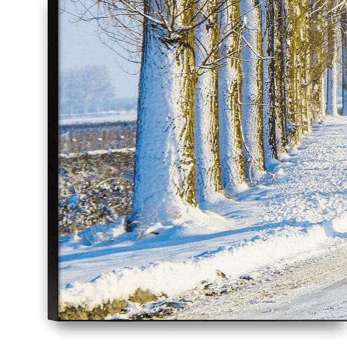 Verschneite Landstraße zwischen Baumreihen in Zeeland Westflandern, Zeeland