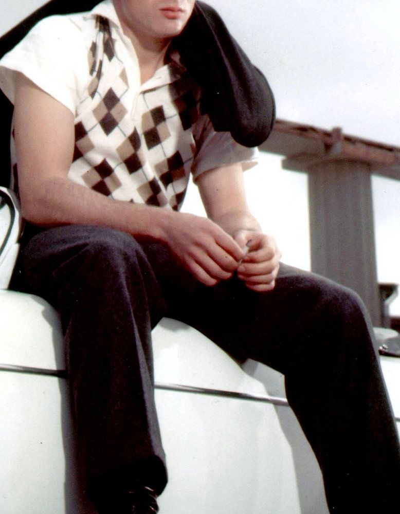 Der Schauspieler James Dean (1931 - 1955) saß auf einem Cabrio-Rennwagen Porsche Speedster wahrscheinlich während eines Autorennens in Palm Springs